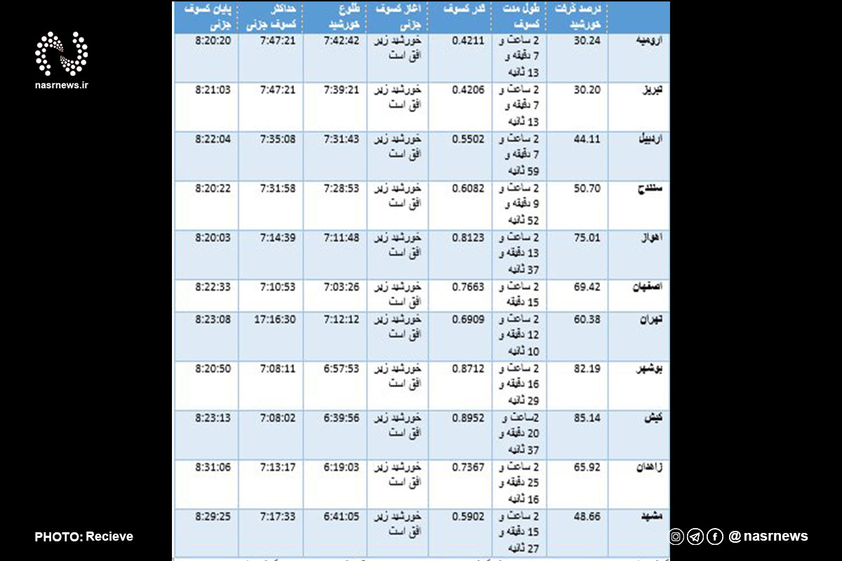 جدول درصد و زمان خورشید گرفتگی در ایران/ کیش بهترین مکان رصد کسوف