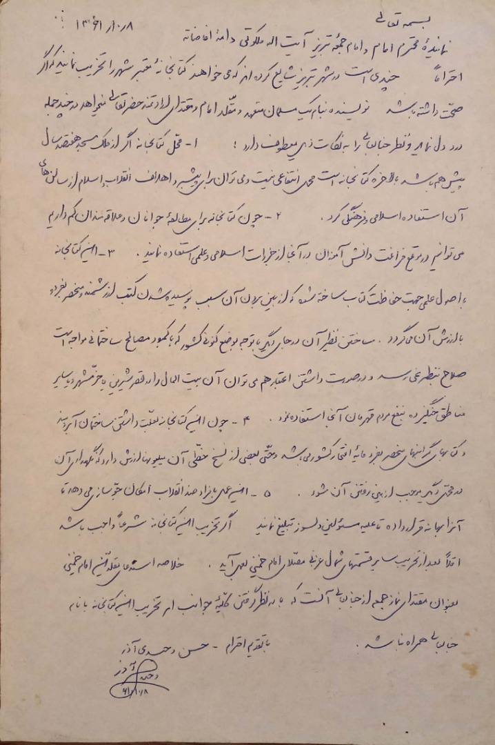 یاد و خاطره آن مرد خستگی ناپذیر در عرصه کار و تلاش و فرهنگ آذربایجان را گرامی داشته و مغفرت الهی و روسفیدی در روز جزا را طالبیم. و در پایان این یاداشت کوتاه، نامه ایشان به مرحوم ملکوتی امام جمعه وقت تبریز و مقامات ملی را