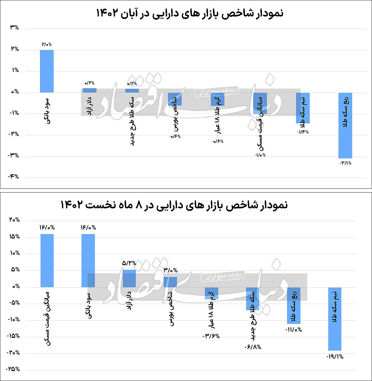 شاخص بازدهی بازار‌ها در ماه هشتم سال و همچنین از ابتدای 1402 تاکنون بررسی شد. بر اساس آمار‌های ثبت شده از روند بازار‌های ارز، طلا و بورس مشاهده می‌شود که نرخ دلار آزاد در ماهی که گذشت حدود 0.2 درصد، سکه طلا طرح جدید 0.17 درصد، هر گرم طلای 18 عیار حدود منفی 0.61 درصد و هر قطعه ربع سکه در آبان ماه منفی 3 درصد رشد را ثبت کرده‌اند. شاخص کل بازار سهام نیز در بازه 30 روز گذشته حدود 0.6 درصد افت داشته است. در نتیجه می‌توان گفت برنده رالی آبان ماه، ‌مانند اکثر ماه‌های سال جاری، نرخ سود بانکی 2 درصدی بوده است.