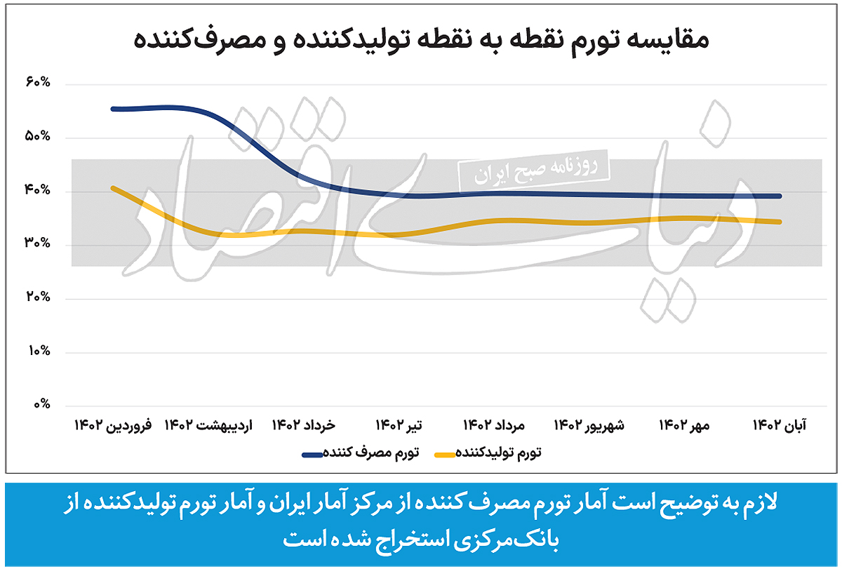 بررسی روند تورم نقطهبهنقطه تولیدکننده نشان میدهد تورم تولیدکننده در فروردینماه سال جاری 40.7 درصد بود و در اردیبهشت به 32.4درصد کاهش یافت. اما از اردیبهشتماه به بعد تورم نقطهبهنقطه تولیدکننده در کریدور 32 تا 35درصد نوسان داشته است. در آبانماه نیز این نرخ به 34.4درصد رسیده است که نشان میدهد نرخ با وجود حضور در کریدور 32 تا 35 درصد یک روند افزایشی را نیز به صورت محدود طی کرده است. نگاهی به آمارها به ما نشان میدهد روند تورم مصرفکننده نیز همگام با تورم تولیدکننده متوقف شده و در سطحی خاص باقی مانده است. به گفته کارشناسان متوقف ماندن این متغیرها در سطح مشخصی ما را به این سو رهنمون میکند که تصور کنیم این متغیرها تحت تاثیر متغیرهای پولی کشور روندی مشابه را طی کردهاند.