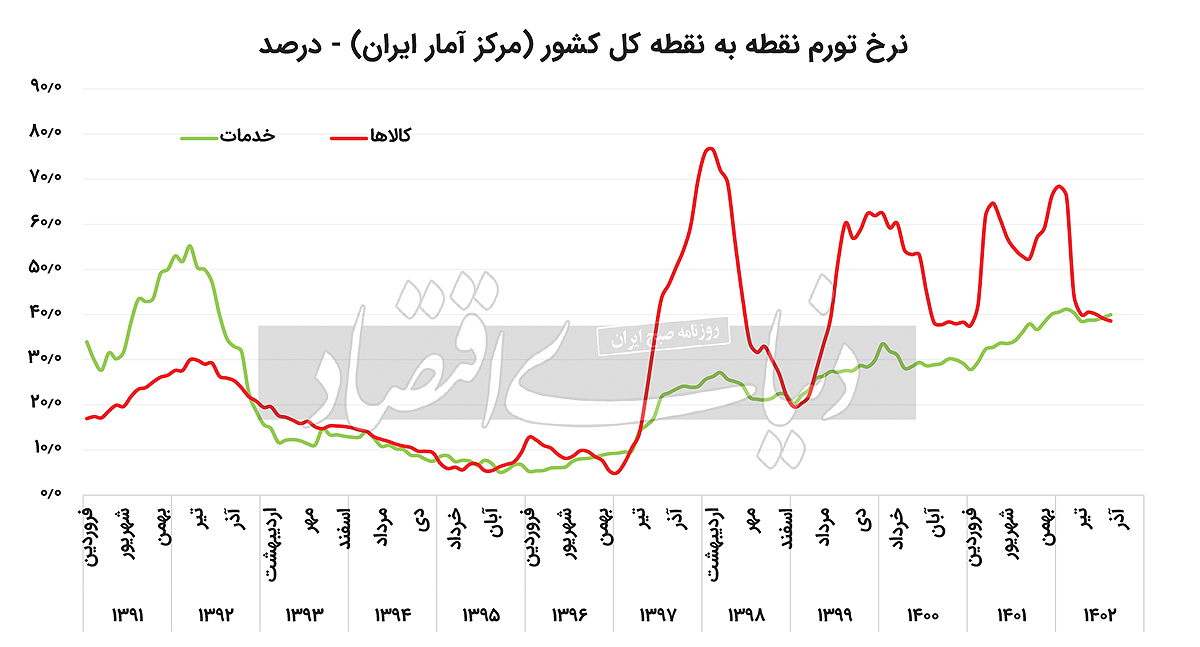 نهادهای آماری نرخ تورم را نه براساس دلایل آن، بلکه براساس مشاهدات میدانی از تغییر قیمتها و ضرایب اهمیت آنها در بودجه خانوار محاسبه میکنند. بنابراین قضاوت درباره افزایش یا کاهش تورم براساس شاخص قیمت مصرفکننده که بهصورت ماهانه از سوی نهادهای آماری کشور منتشر میشود میتواند گمراهکننده باشد. بنابراین باید دنبال شاخصی برای شناسایی تورم بود. با اندکی تسامح شاید بتوان نرخ تورم خدمات را شاخصی برای این منظور، حداقل برای دهه اخیر دانست. اگر این شاخص پذیرفته شود، مشاهده خواهد شد که بهرغم روند کاهشی تورم کالاها از ابتدای امسال، تورم خدمات تغییر محسوسی ندارد و به روند صعودی خود که از ابتدای سال ۱۳۹۷ آغاز شده همچنان ادامه میدهد. تورم کالاها نیز بهرغم فراز و فرودهایی که در نتیجه شوکهای ارزی این دوره داشته، پس از پشت سرگذاشتن شوکهای ارزی زمستان ۱۴۰۱، بهتدریج خود را به تورم خدمات نزدیک میکند.