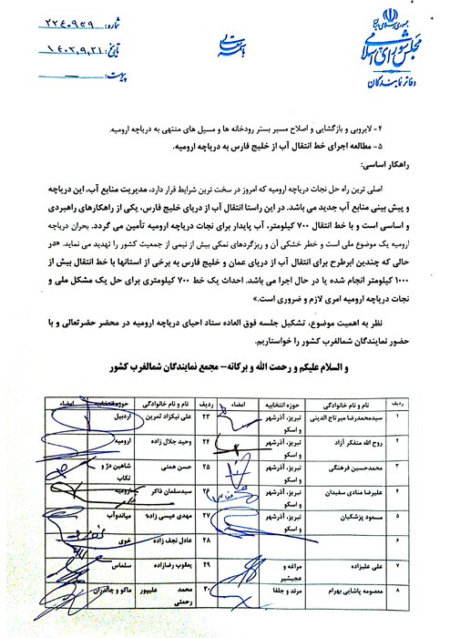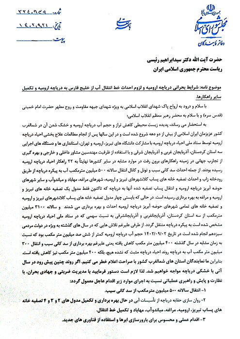 بر اساس این گزارش، این نامه با امضای قریب باتفاق نمایندگان شمالغرب کشور خدمت رئیس جمهور ارسال شده است.