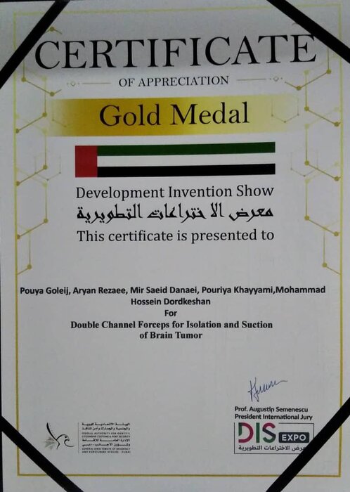 به گزارش نصر، پوریا خیامی روز جمعه در گفت و گویی اظهار کرد: اختراعی در زمینه پزشکی با عنوان "ابزاری برای مکش تومورها در انواع سرطان" به مسابقات ابداعات و اختراعات ارسال و مدال طلای مسابقات دبی را به خود اختصاص داد.