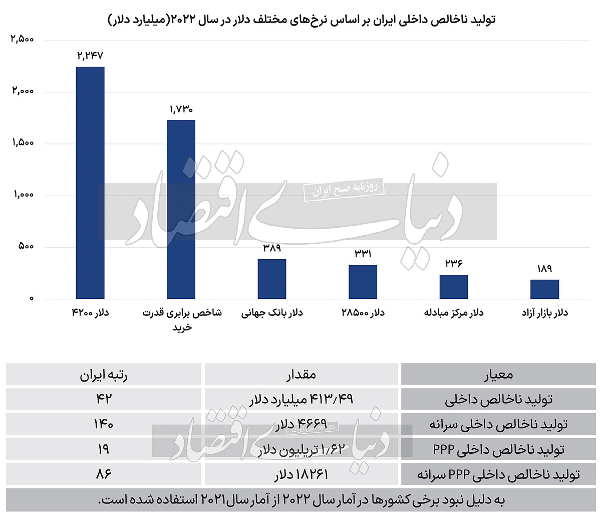 مهمترین ابزار اقتصادی برای مقایسه کشورهای مختلف، تولید ناخالص داخلی است. این شاخص ارزش بازاری کالاها و خدمات تولیدشده طی یک سال در هر اقتصاد را اندازهگیری میکند و این قابلیت را به ناظران میدهد تا بتوانند از نظر میزان تولیدات، کشورهای مختلف را تقسیمبندی کنند. در یک تقسیمبندی کلی، میتوان این شاخص را با سه معیار پول ملی، دلار و برابری قدرت خرید سنجید. اظهارات اخیر رئیس سازمان برنامه و بودجه موجب شده بحثها پیرامون ابعاد اقتصاد ایران از سر گرفته شود. بر این اساس، داود منظور در توییتی گفت که طبق آخرین آمارهای صندوق بینالمللی پول، ایران با تولید ناخالص داخلی 1.81تریلیون دلار (بر اساس شاخص برابری قدرت خرید)، نوزدهمین اقتصاد دنیاست. این صحبتها واکنشهای زیادی را در بر داشت و موجب شد منظور در ادامه شاخص برابری قدرت خرید را برای مخاطبانش توضیح دهد. همین چالش موجب شد «دنیای اقتصاد» بار دیگر اندازه اقتصاد ایران را بررسی کند. اگرچه که این آمار بر اساس گزارش صندوق بینالمللی درست بوده است، اما باید به چند نکته در مقایسه تولید ناخالص داخلی کشورها توجه کرد.
