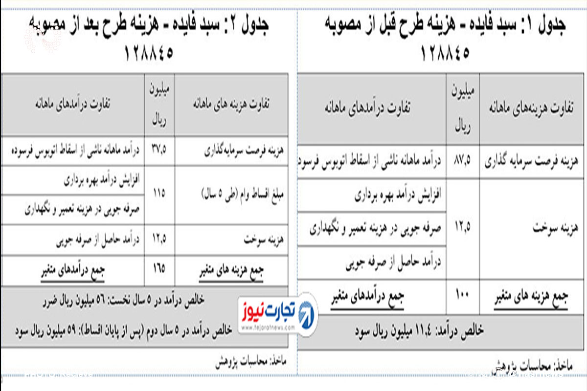 از این رو طرح همچنان با عدم استقبال عملی ذینفعان روبهرو شده و نتوانسته وارد گذار عملیاتی شود. جدول 1 و 2 سبد فایده-هزینه طرح را قبل از مصوبه شماره 128845 شورای اقتصاد و پس از آن نشان میدهد، که در آنها با در نظر گرفتن شرایط و تسهیلات طرح، تفاوت هزینه و درآمد ماهانه نوسازی ناوگان فرسوده برای سرمایهگذار مقایسه شده است (در این جداول تنها هزینه و درآمدهایی که طی نوسازی تغییر میکنند آورده شده است).