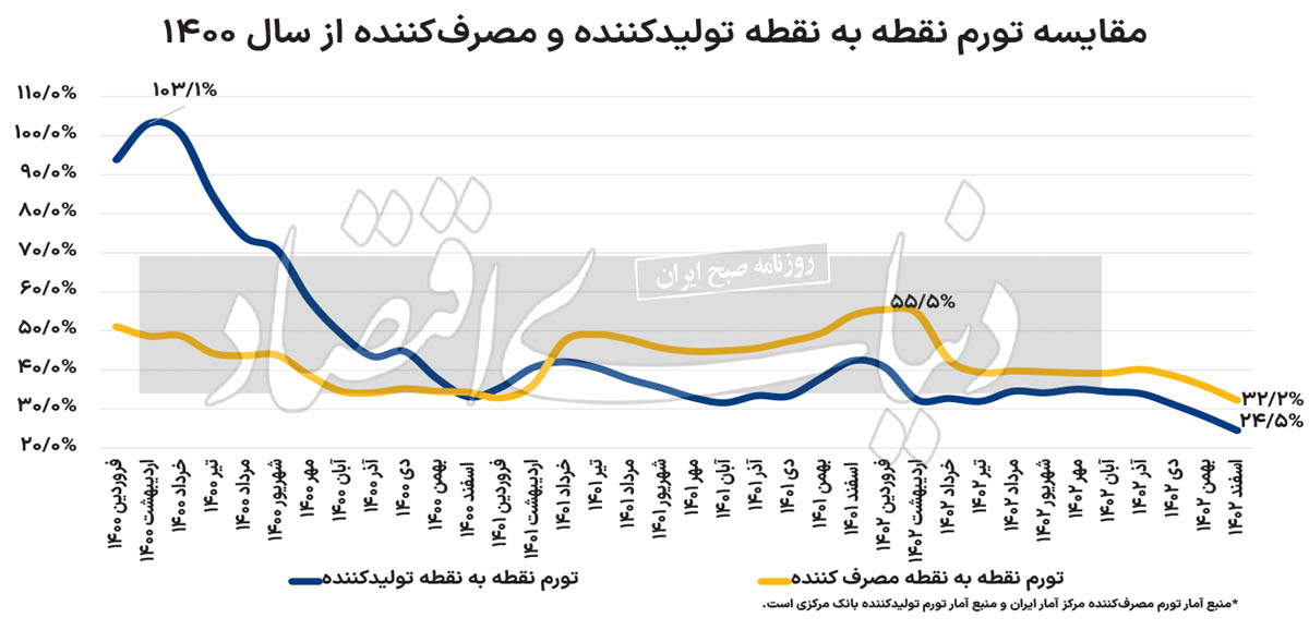 بررسی روند تورم تولیدکننده از سال 1400 تاکنون نشان میدهد این شاخص بهعنوان نمایانگر وضعیت قیمتی نهادههای تولیدی در اردیبهشت 1400 به 103.1درصد رسیده است که دست کم در سه سال اخیر بالاترین نرخ تورم تولیدکننده محسوب میشود. پس از این تاریخ نرخ تورم تولیدکننده مسیری کاهشی را تجربه کرد و در اسفندماه1402 به 24.5درصد رسید. این رقم پایینترین نرخ تورم نقطه به نقطه تولیدکننده از خردادماه1399 محسوب میشود. همزمان با این روند، تورم نقطه به نقطه مصرفکننده نیز در فروردین1402 در قله 55.5درصد ایستاد که دستکم در 12 سال اخیر بیسابقه بود؛ اما پس از فروردینماه، با کاهش نسبی روبهرو شد که تا حدود زیادی میتوان آن را به ثبات نسبی ارز و کاهش نرخ رشد نقدینگی در سال1402 نسبت داد. تورم نقطه به نقطه مصرفکننده با کاهش 23.3واحد درصدی نسبت به قله 12سال خود در فروردین، در اسفندماه1402 به 32.2درصد رسید که از مردادماه1399 بیسابقه بوده است. این روند، همزمان با کاهش 8.8واحد درصدی رشد نقطه به نقطه نقدینگی نسبت به فروردینماه و رسیدن این شاخص به 24.3درصد در اسفندماه طی شده است.
