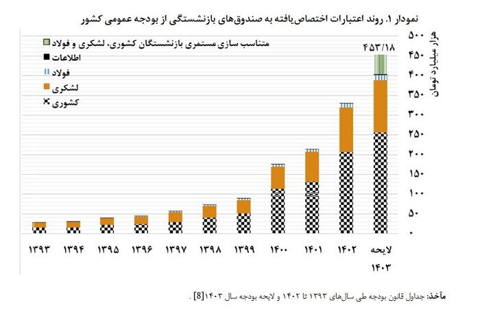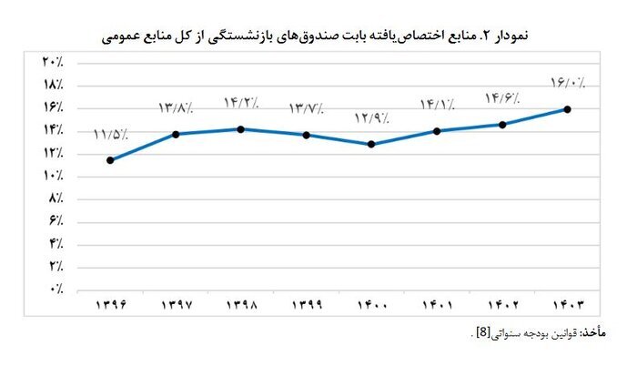 به گزارش نصر، سالیانه درصد قابل توجهی از کل مصارف بودجه عمومی کشور در راستای کمک به بازپرداخت تعهدهای صندوقهای بازنشستگی هزینه میشود. روند نسبت اعتبارات اختصاص یافته به صندوقهای بازنشستگی یادشده به کل بودجه عمومی دولت از ۱۴.۶ درصد در قانون بودجه پارسال به ۱۶ درصد در لایحه بودجه ۱۴۰۳ افزایش یافته است.