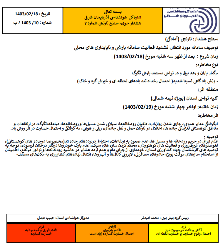 به گزارش نصر، اداره کل هواشناسی استان با صدور هشدار نارنجی اعلام کرد: از عصر امروز، تشدید سامانه بارشی، موجب رگبار باران و رعد برق در همه نواحی آذربایجان شرقی بویژه مناطق شمالی و در نواحی مستعد، بارش تگرگ و وزش باد گاهی نسبتا شدید خواهد شد که احتمال رخداد تندبادهای لحظهای و خیزش گرد و خاک دور از انتظار نیست.