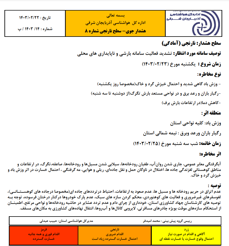احتمال آبگرفتگی معابر عمومی، جاری شدن روان آب، طغیان رودخانه ها، سیلابی شدن مسیلها و رودخانه ها، صاعقه، تگرگ در ارتفاعات و مناطق کوهستانی، لغزندگی جاده ها، اختلال در ناوگان حمل و نقل جاده ای، ریلی و هوایی، مه گرفتگی، احتمال خسارت در اثر وزش باد و خیزش گرد و خاک دور از انتظار نیست.