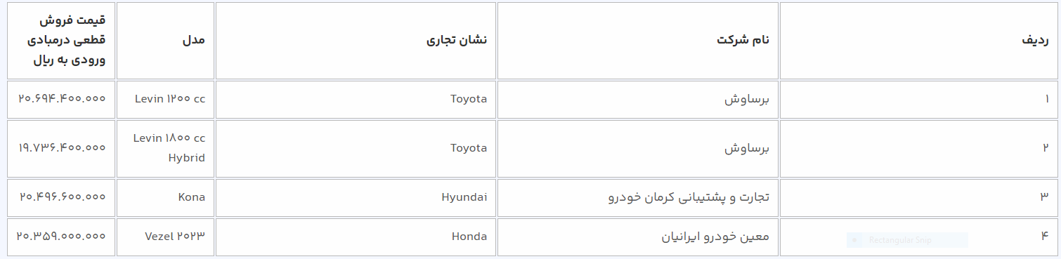 جدول شماره ۱: قیمت فروش محاسباتی قطعی خودروهای وارداتی در مبادی ورودی واحد: دستگاه/ ریال