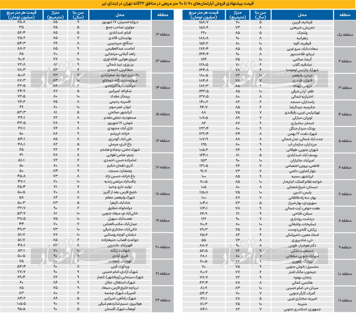 «دنیایاقتصاد» از ابتدای امسال، به سنجش شاخص قیمت در فایلهای در نوبت فروش بازار مسکن در 22 منطقه تهران اقدام کرد. این شاخص در ابتدای هر ماه مورد ارزیابی قرار میگیرد و علت این سنجش، توقف مقطعی انتشار آمار رسمی قیمت مسکن در معاملات انجام شده در بازار املاک شهر تهران است. «قیمت پیشنهادی» یک مرحله قبل از «قیمت قطعی» معاملات مسکن است؛ قیمت پیشنهادی فروشندهها پس از مذاکره و بازاریابی تغییر میکند و قیمت قطعی فروش با سطح بالاتر یا پایینتر در قراردادها ثبت میشود.