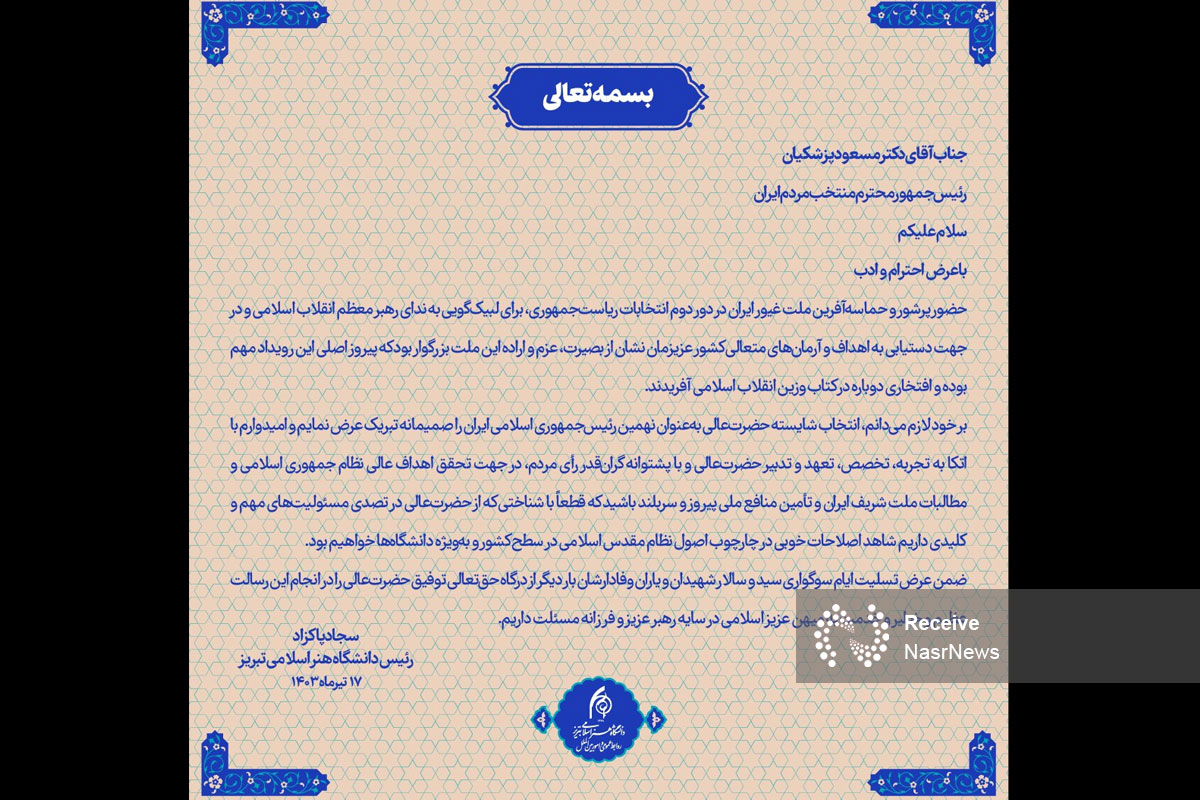 در پیام تبریک رئیس دانشگاه هنر اسلامی تبریز به رئیس جمهور منتخب مطرح شد:
