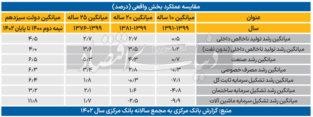 این آمار بهخوبی بیانگر سرمایهگذاری مناسب در کشور است و بنابراین آمار رشد اقتصادی همچنان مثبت و پایدار باقی خواهد ماند. رئیسکل بانکمرکزی اظهار کرد: در دولت سیزدهم میانگین رشد تولید ناخالص داخلی 4.5درصد، میانگین رشد تولید ناخالص داخلی بدوننفت 4درصد، میانگین رشد صنعت 6.5درصد، میانگین رشد مصرف خصوصی 6.3درصد، میانگین رشد تشکیل سرمایه ثابت کل 6.4درصد، میانگین رشد تشکیل سرمایه ساختمان 3.2درصد و میانگین رشد تشکیل سرمایه ماشینآلات 11.8درصد بودهاست که این آمار تفاوت معناداری با میانگینهای بلندمدت دارد.فرزین سرمایهگذاری در بخش مسکن در سال1402 را نیز امیدوارکننده برشمرد و گفت: سرمایهگذاری بخشخصوصی برحسب قیمت واقعی در کل مناطق شهری در سالگذشته 7.8درصد رشد داشتهاست و در ساختمانهای جدید برحسب قیمتهای واقعی و در مقایسه با سال1401 معادل 17.1درصد رشد را نشان میدهد و امیدواریم این روند به بهبود وضعیت مسکن در کشور کمک کند.