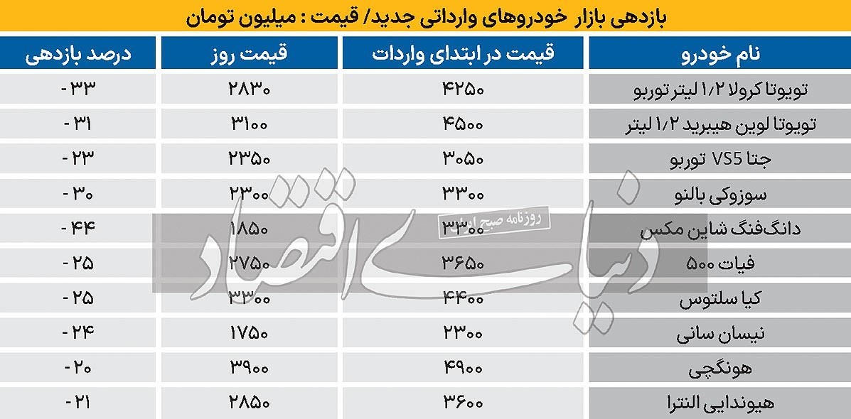 بااینحال محاسبات «دنیای اقتصاد» نشان میدهد قیمت خودروهای خارجی جدید (با ملاک قرار دادن 10 خودروی منتخب در این گزارش) بین 20 تا 44درصد افت کرده است.