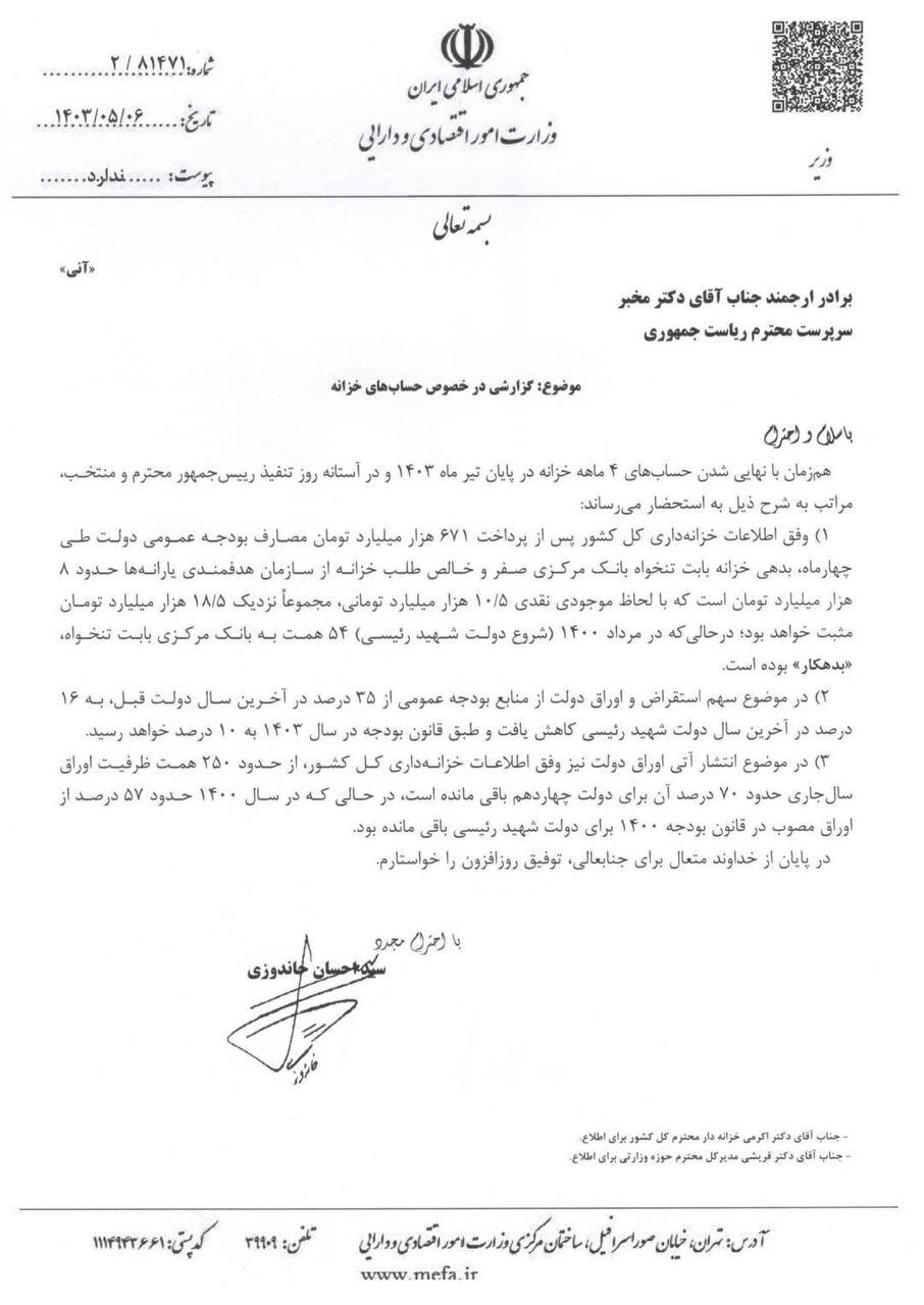 «هم زمان با نهایی شدن حسابهای ۴ ماهه خزانه در پایان تیر ماه ۱۴۰۳ و در آستانه روز تنفیذ رئیس جمهور محترم و منتخب مراتب به شرح ذیل به استحضار میرساند: