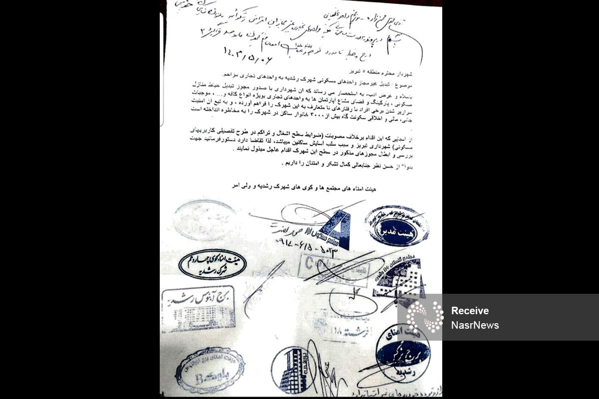 بر پایه ی این گزارش به دنبال بروز مشکلات ترافیکی و البته اجتماعی از اهمال شهرداری منطقه پنج و اداره اماکن در صدور مجوز تجاری برای این واحد های سکونتی، هیئت امناهای شهرک رشدیه به نمایندگی از سه هزار خانواده ی ساکن، شکوائیه ای را تنظیم و تقدیم شهردار منطقه 5 تبریز نموده اند که دکترپورخردمند پس از استماع شکایت اهالی این شهرک، در هامش شکوائیه دستور توقف روند مخرب فعلی در اعطای مجوز های تغییر کاربری و انعکاس موضوع به کمیسیون ماده 100 را صادر نمودند.