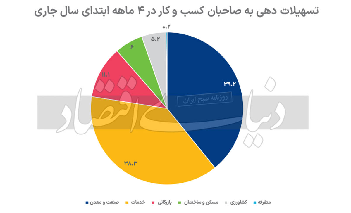این مساله ممکن است به دلیل اتخاذ سیاست کنترل ترازنامهای توسط بانکمرکزی و روند کاهشی رشد نقدینگی در سالگذشته باشد. از کل تسهیلات پرداختی، بر اساس گزارش بانکمرکزی مبلغ یکهزار و 328هزارمیلیاردتومان که معادل 78.3درصد کل تسهیلات پرداختی است به صاحبان کسبوکار (حقوقی و غیرحقوقی) و 367هزار میلیاردتومان که معادل 21.7درصد از کل تسهیلات پرداختی است به مصرفکنندگان نهایی که خانوارها هستند تعلق گرفتهاست. سهم تسهیلات پرداختی در قالب سرمایهدرگردش در کلیه بخشهای اقتصادی طی 4 ماهه ابتدای سال1403 نیز مبلغ 1003هزار میلیاردتومان بوده که معادل75.5درصد کل تسهیلات پرداختی به صاحبان کسبوکار است. از این مبلغ بیشترین سهم به بخش صنعت و معدن با 447هزارمیلیاردتومان تعلق گرفته که حاکی از تخصیص 44.6درصدی منابع تخصیصیافته به سرمایه درگردش کلیه بخشهای اقتصادی است. این امر بیانگر توجه و اولویتدهی به تامین منابع برای این بخش توسط بانکها در سال1403 است، پس از آن نیز بخشهای خدمات، بازرگانی، کشاورزی، مسکن و ساختمان به ترتیب بیشترین سهم را از تسهیلات پرداختی در قالب سرمایهدرگردش دارند.
