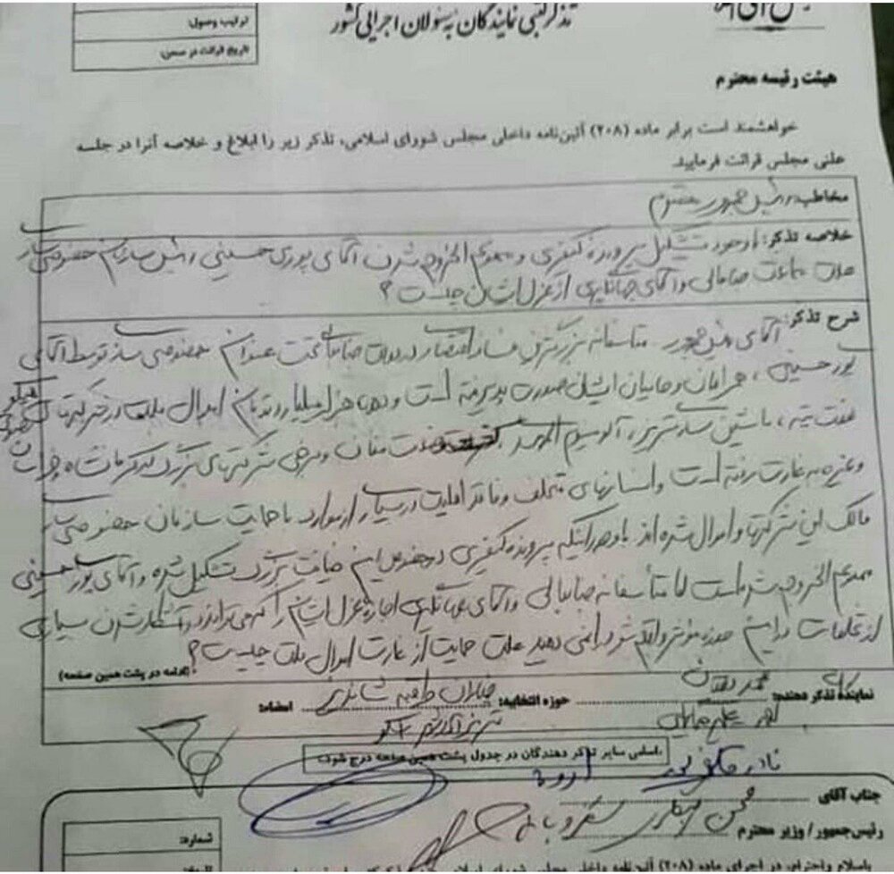 به گزارش نصر به نقل از مهر، 100 نماینده مجلس شورای اسلامی تذکری خطاب به رئیس جمهور در اعتراض به عدم عزل رئیس متخلف سازمان خصوصی سازی را به امضا رساندند.