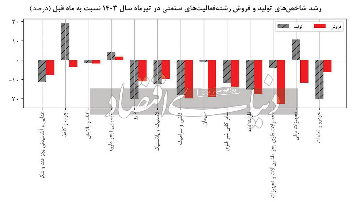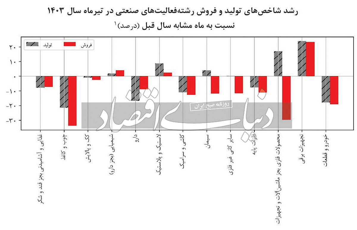طی تیرماه سال ١٤٠٣ نسبت به ماه مشابه سال قبل، رشتهفعالیتهای تجهیزات برقی، محصولات فلزی بهجز ماشینآلات و تجهیزات و لاستیک و پلاستیک بیشترین سهم را در افزایش شاخص تولید و رشتهفعالیتهای خودرو و قطعات، دارو و کاشی و سرامیک، بیشترین سهم را در کاهش شاخص تولید داشتهاند. همچنین رشتهفعالیتهای تجهیزات برقی، شیمیایی (بهجز دارو) و لاستیک و پلاستیک بیشترین سهم را در افزایش شاخص فروش و رشتهفعالیتهای محصولات فلزی بهجز ماشینآلات و تجهیزات، کاشی و سرامیک و خودرو و قطعات، بیشترین سهم را در کاهش شاخص فروش بهخود اختصاص دادهاند. همچنین، طی تیرماه سال ١٤٠٣ نسبت به ماه قبل، رشتهفعالیتهای تجهیزات برقی، چوب و کاغذ و شیمیایی (بهجز دارو) بیشترین سهم را در افزایش شاخص تولید و رشتهفعالیتهای کاشی و سرامیک، خودرو و قطعات و دارو بیشترین سهم را در کاهش شاخص تولید داشتهاند. همچنین رشتهفعالیتهای کاشی و سرامیک، تجهیزات برقی و محصولات فلزی بهجز ماشینآلات و تجهیزات بیشترین سهم را در کاهش شاخص فروش به خود اختصاص دادهاند و تنها رشتهفعالیت شیمیایی (بهجز دارو) افزایش در شاخص فروش داشته است.