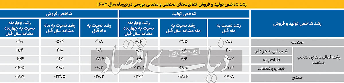 در تیرماه سال ١٤٠٣، شاخص تولید و فروش شرکتهای صنعتی بورسی نسبت به ماه مشابه سال قبل کاهش ۳.۵ و ۵.۴درصدی را تجربه کرده است؛ همچنین شاخصهای تولید و فروش نسبت به ماه قبل کاهش ٨ و ۹.۸درصدی داشتهاند. نکته قابلتوجه در این گزارش این است که در تیرماه امسال از بین ١٥رشتهفعالیت صنعتی بورسی، تنها ٤رشتهفعالیت افزایش در شاخص فروش و ١١رشتهفعالیت کاهش در شاخص فروش را تجربه کردهاند. همچنین از بین ١٥رشتهفعالیت صنعتی بورسی، ٦رشتهفعالیت افزایش در شاخص تولید و ٩رشتهفعالیت کاهش در شاخص تولید را ثبت کردهاند.