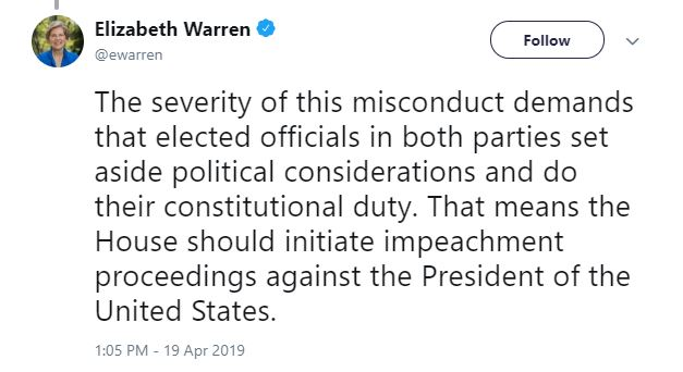 وارن طی یک رشته توئیت در صفحه شخصی خود ضمن اشاره به جزئیات گزارش مولر حول ممانعت ترامپ از طی شدن مسیر تحقیقات درباره ارتباط با روسیه، نوشت: «گزارش مولر حقایقی را نشان میدهد که یک دولت خارجی متخاصم به انتخابات ۲۰۱۶ برای کمک به ترامپ حمله کرده و ترامپ نیز از این کمک استقبال نمود. زمانی هم که ترامپ به ریاستجمهوری انتخاب شد، مانع تحقیقات درباره این حمله شد».