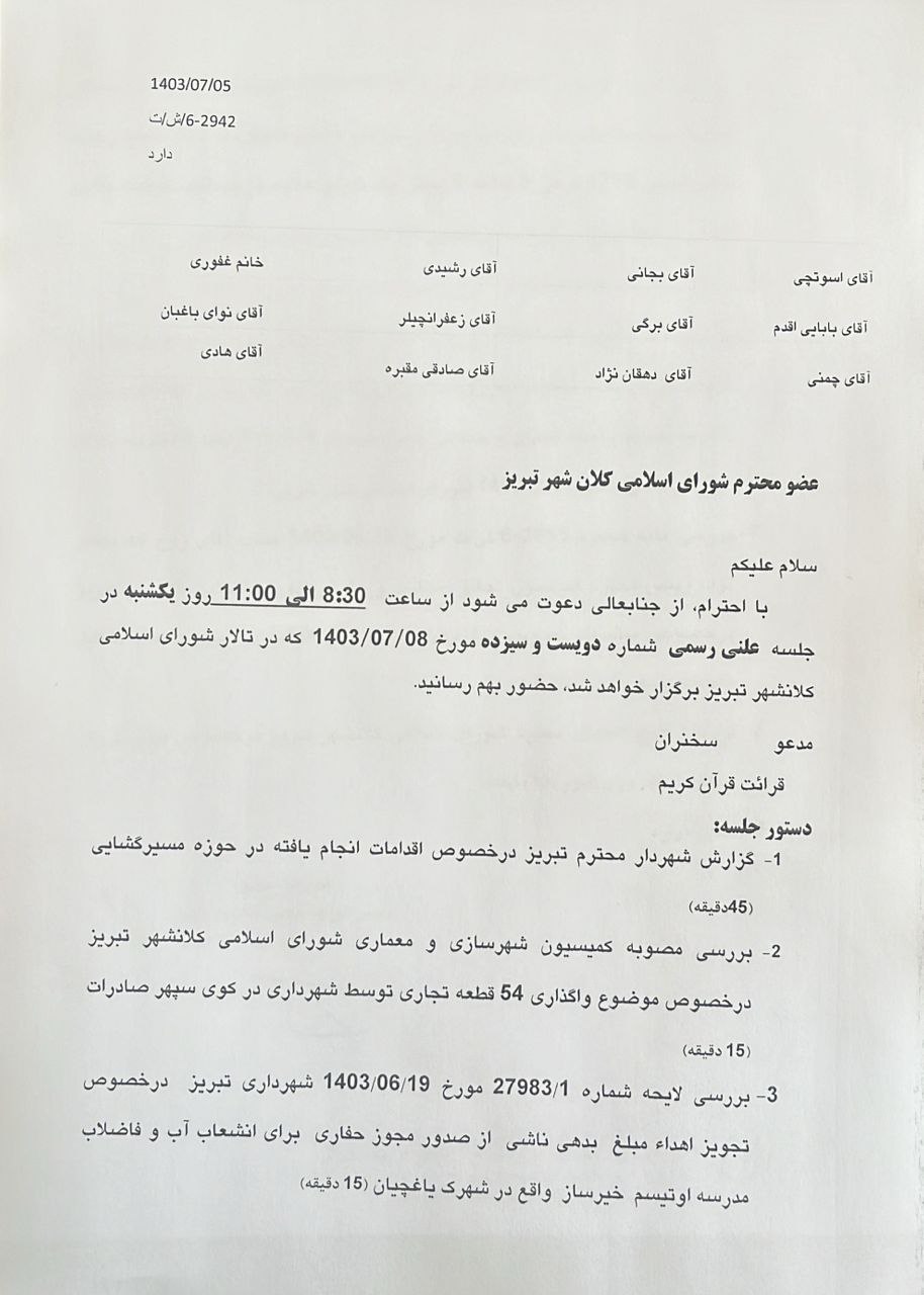 به گزارش نصر، غلامرضا احمدی رئیس شورای اسلامی شهر تبریز دستور جلسه روز یکشنبه ۸ مهر ماه را به اعضای شورا ارسال کرد که نام پرویز هادی عضو شورا که پیش از این از سوی یونس فاتح فرماندار شهرستان تبریز عضویتش به دلیل غیبتهای طولانی تعلیق شده بود دیده میشود.