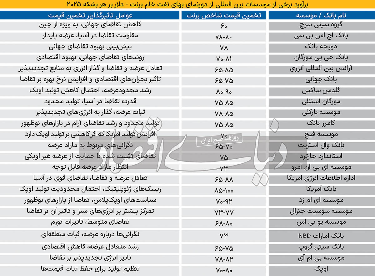 نصر: موسسه بینالمللی و بانکهای معتبر جهانی، چشمانداز قیمت نفت در سال آینده میلادی را براساس مجموعههایی از فاکتورهای اثرگذار همچون ریسکهای اقتصادی و غیراقتصادی، ترسیم کردند.