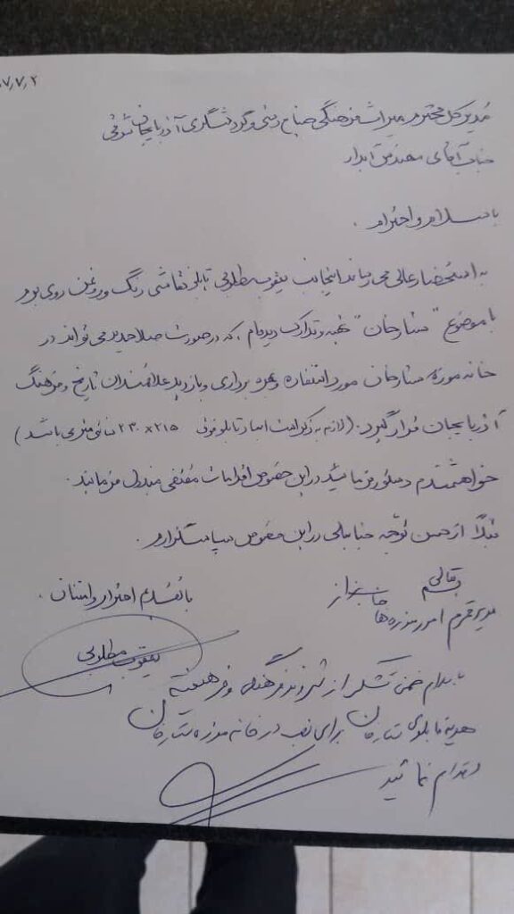 با احترام ادب … در مورخه ۹۷/۷/۲ بجهت اهدایی تابلوی ستارخان روی برزنت به ابعاد ۲/۱۵ در ۲/۳۰ رنگ و روغن و به سبک سمبولیک. بعد از ۸ ماه تحقیق و مطالعه وقرار گرفتن در شرایط مناسب و طراحی و غیره … به همراه نامه کتبی به میراث فرهنگی تبریز خدمت مهندس آبدار ( رئیس میراث فرهنگی وقت ) مراجعه و تابلوی لوله شده رو بهمراه مکتوب و توضیح در خصوص تابلو که در هایت منجر به دستور نصب در موزه ستارخان بصورت کتبی و برای مهندس بزاز توسط جناب آبدارصادر گردید . فلذا تابلوی لوله شده بجهت تحویل و شماره برای نامه به دبیر خانه میراث فرهنگی مراجعه و در نهایت با تابلوی ستارخان وداع نمودم . و در آن زمان ظاهر خانه ستارخان در تعمیرات ساختمانی بود و قرار بر این شد بعد از اتمام تعمیرات و نصب مراسمی برگزار و از تاباو رو نمایی گردد. علیهذا از تاریخ یاد شده بعد از پرسجو ها و مرجعات مکرر و ردیابیهای انجام شده دریغا که اثری از تابلو و اینکه کجا هست و یا کجا نصب گردیده اطلاعی بدست نیامد ..