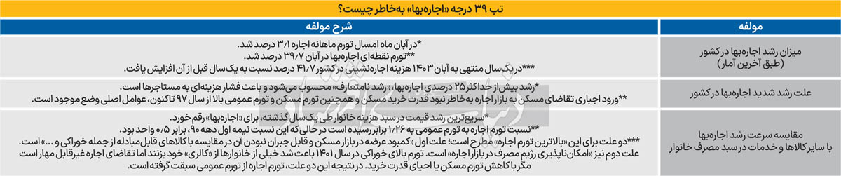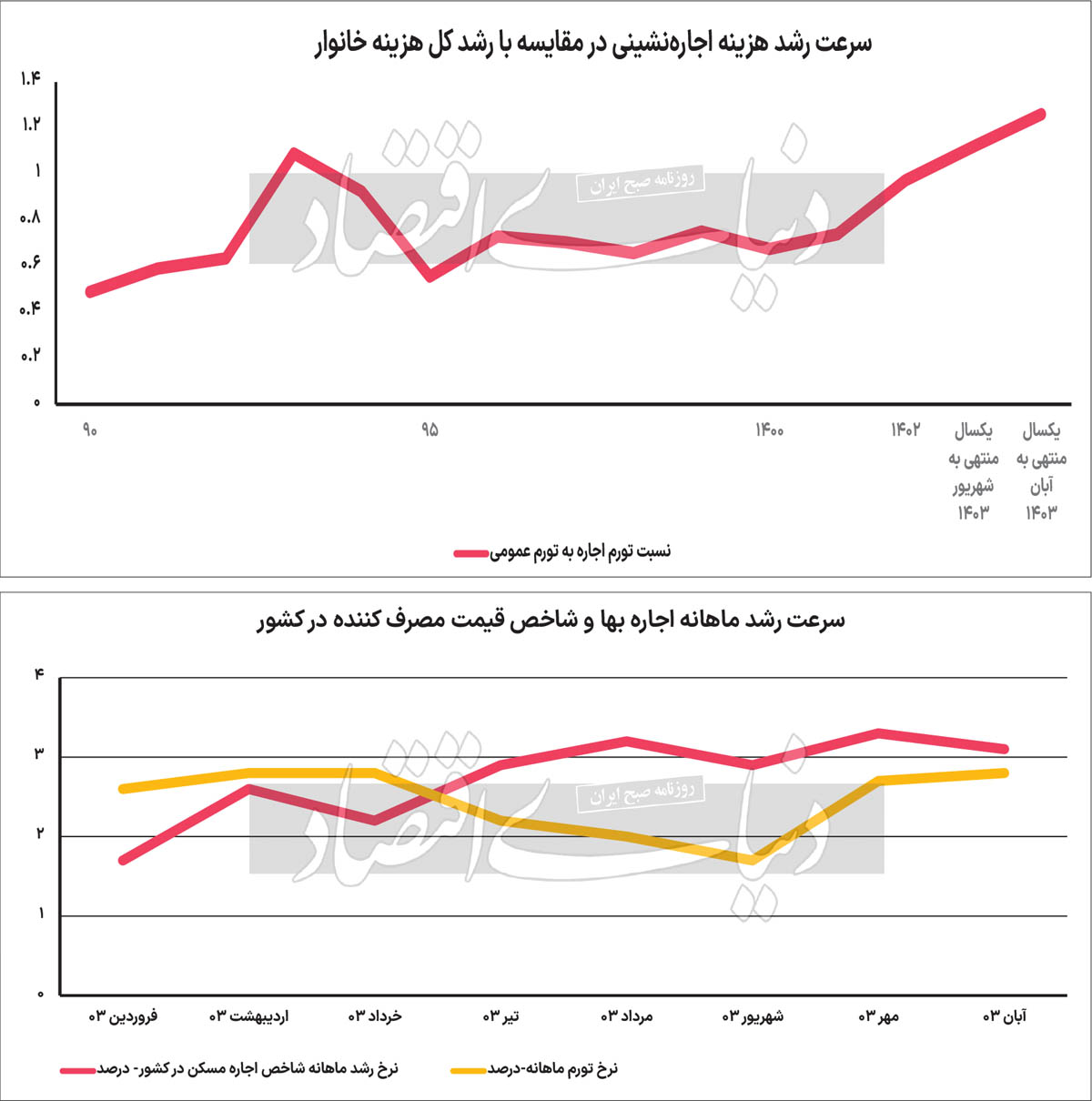 مرکز آمار ایران تورم عمومی سالانه آبان ماه کشور را برابر 33.1درصد و تورم عمومی نقطه به نقطه را با رشد 32.5درصدی اعلام کرد؛ این در حالی بود که شاخص کل تورم برای آبان ماه نسبت به ماه قبل (مهر) رشدی 2.8درصدی داشت. بررسی زیرشاخههای تورم برای آبان ماه از آن حکایت دارد که بخش مسکن پیشتاز رشد تورم بوده است؛ به نحوی که تورم سالانه مسکن برای آبان ماه با رشدی 41.7 درصدی، تورم نقطهای مسکن با افزایشی 39.6 درصدی و تورم ماهانه آن با افزایشی 3.1 درصدی اعلام شده است. در واقع به نظر میرسد که جهش مستمر اجارهبها در کشور، یکی از عوامل اصلی صعود تورم عمومی طی ماههای اخیر بوده است. در حالی تورم سالانه اجارهبها در آبان ماه برابر 41.7درصد اعلام شد که طی 3 سال متوالی اخیر تورم اجاره در کشور در کانال 40 درصدی تثبیت شده است؛ استمرار تورم بیش از 40 درصدی در بخش اجارهبها، در شرایطی که شاخص کل تورم نیز در کانال 30 درصدی نوسان دارد؛ به شکل موثری از کیفیت زندگی مستاجران کاسته است.