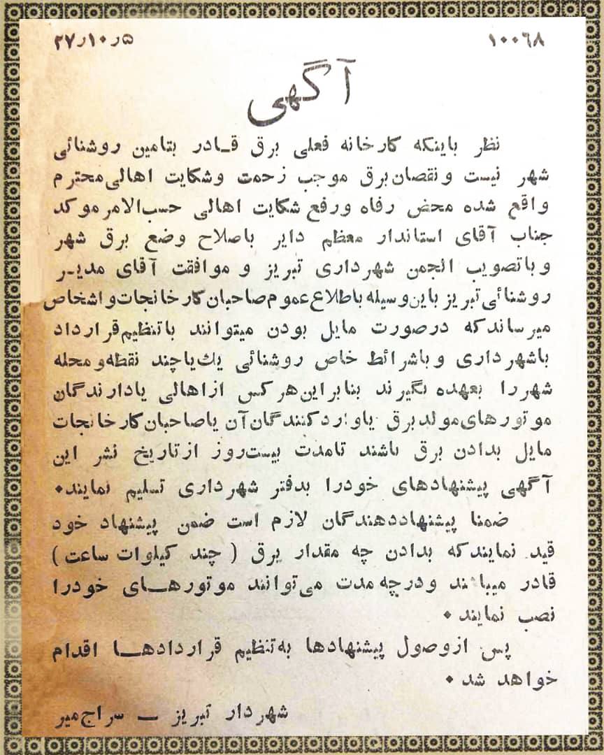 به گزارش نصر؛ ایوب نیکنام لاله نویسنده و پژوهشگر آذربایجان در مطلبی نوشت: در سال 1326 خورشیدی، اداره روشنایی(برق ) تبریز بر اساس دستور دولت و با هدف دلجویی از مردم تبریز در ماجرای پیشه‌وری، به بعضی از مناطق فاقد روشنائی، برق می‌دهند.