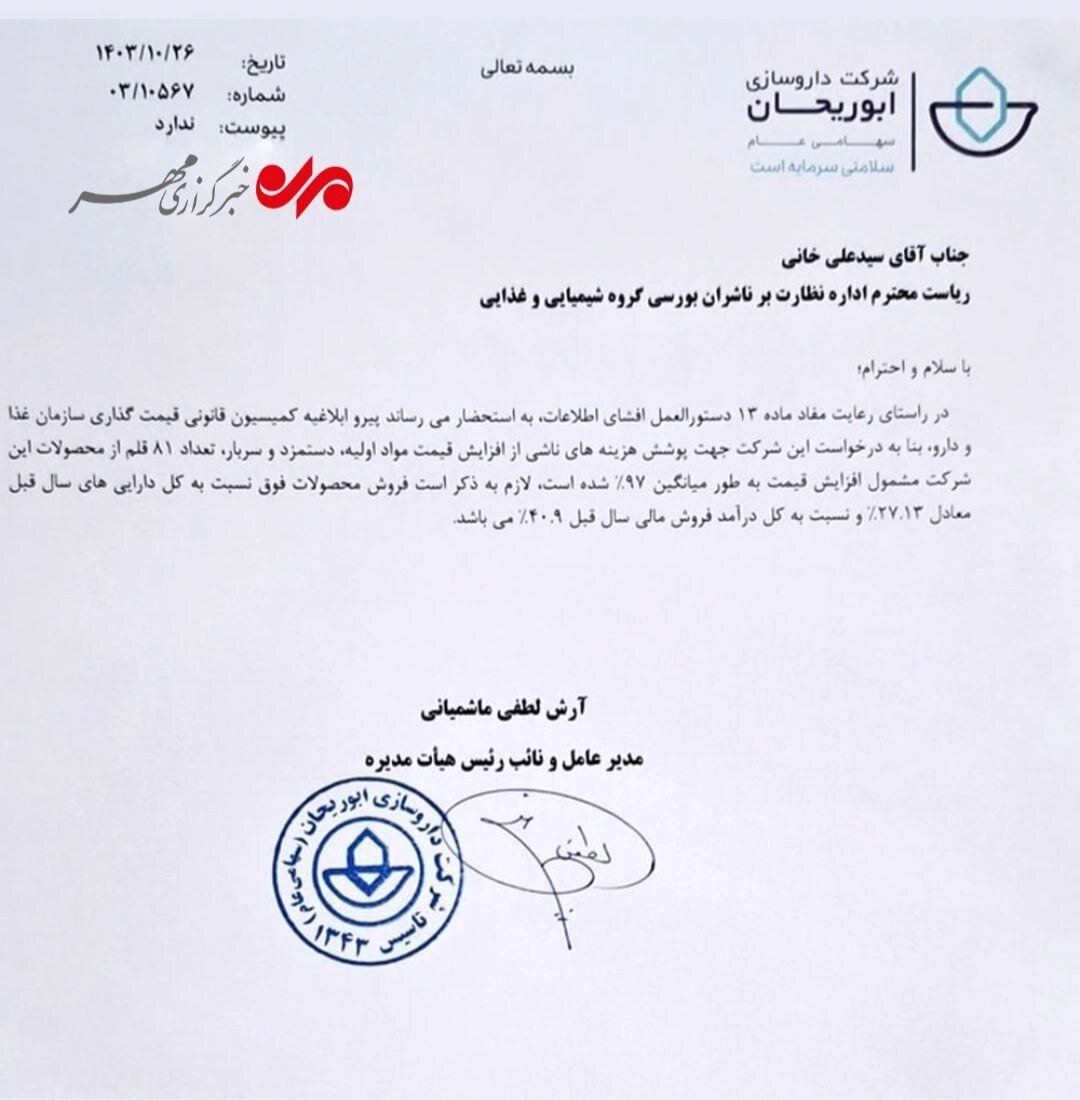 همچنین؛ مدیرعامل شرکت داروسازی ابوریحان با ارسال نامه‌ای به رئیس اداره نظارت بر ناشران بورسی گروه شیمیایی و غذایی افزایش قیمت ۸۱ قلم از محصولات این شرکت را با میانگین ۹۷ درصد افزایش اعلام کرد.