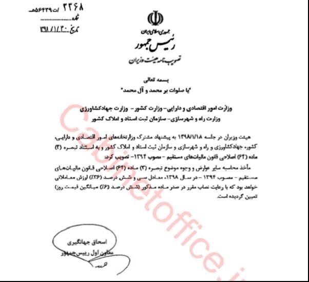 به گزارش نصر به نقل از مهر، اسحاق جهانگیری معاون اول رئیس جمهوری مصوبه هیئت وزیران در جلسه 18 فروردین ماه 1398 که به پیشنهاد مشترک وزارت خانههای امور اقتصادی و دارایی، کشور، جهاد کشاورزی، راه و شهرسازی و سازمان ثبت اسناد و املاک کشور و به استناد تبصره 3 ماده 64 اصلاحی قانون مالیاتهای مستقیم، در خصوص درصد ارزش معاملاتی املاک به عنوان مأخذ سایر عوارض به تصویب رسیده بود را به دستگاههای ذی ربط ابلاغ کرد.
