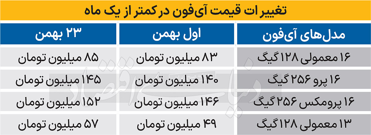 اکنون بررسیهای «دنیایاقتصاد» نشان میدهد با وجود اینکه در نیمه ابتدایی بهمنماه قیمت آیفون ۱۶ معمولی با حافظه ۲۵۶ گیگابایت حدود ۸۳میلیون تومان برآورد میشد، قیمت آن تا ۲۰بهمن در برخی از فروشگاهها حتی تا ۱۱۳میلیون تومان بالا رفته است. همچنین قیمت آیفون ۱۶پرو با حافظه ۲۵۶گیگابایت که در ۱۱بهمن ۱۲۷میلیون تومان قیمتگذاری شده بود، در این روز تا ۱۴۰میلیون تومان بالا رفته است.