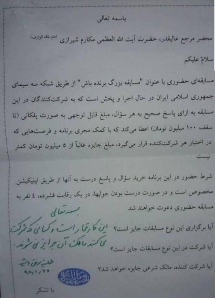 پاسخ آیتالله مکارم شیرازی: "بسمهتعالی- این کار قمار است و کسانی که شرکت میکنند مالک آن جوایز نمیشوند. همیشه موفق باشید"