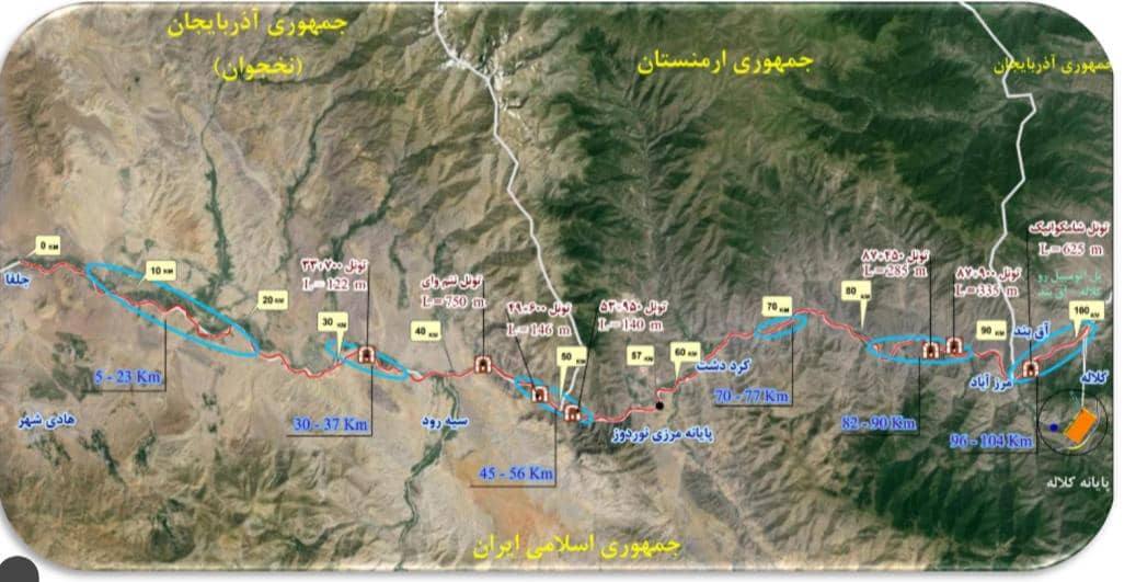 ۵/اما سهم ایران از کلاله به مرز نخجوان در شهر مرزی ایران حدود ۱۰۷ کیلومتر است.این جاده نزدیک به ۱۴ متر عرض در دو باند مجزا ۱۴ متری در حال ساخت است که خوشبختانه موسسه عاشورای قرار گاه خاتم الانبیا ص از آبان ماه گذشته با انتقال ماشین آلات و تجهیزات سبک و سنگین راهسازی بدنبال تحقق انجام این معاهده مهم ایران با جمهوری آذربایجان است.