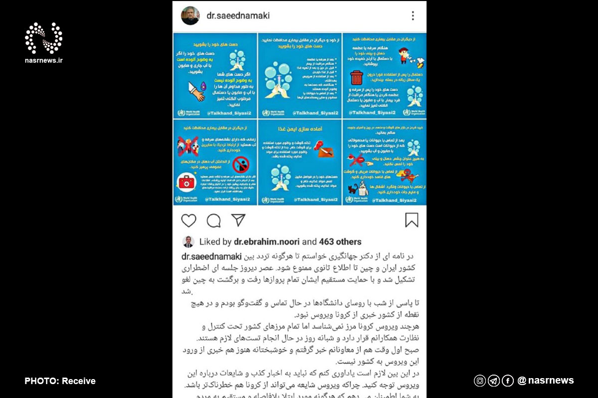 به گزارش نصر به نقل از فارس، سعید نمکی وزیر بهداشت در صفحه اینستاگرام خود نوشت: در نامه ای از دکتر جهانگیری خواستم تا هرگونه تردد بین کشور ایران و چین تا اطلاع ثانوی ممنوع شود. عصر دیروز جلسه ای اضطراری تشکیل شد و با حمایت مستقیم ایشان تمام پروازها رفت و برگشت به چین لغو شد.