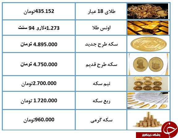 قیمت هر گرم طلای ۱۸ عیار در بازار آزاد به ۴۳۵ هزار و ۱۵۲ تومان رسید و هر اونس طلا در بازارهای جهانی با قیمت ۱.۲۷۳ دلار و ۹۴ سنت دلار معامله شد.