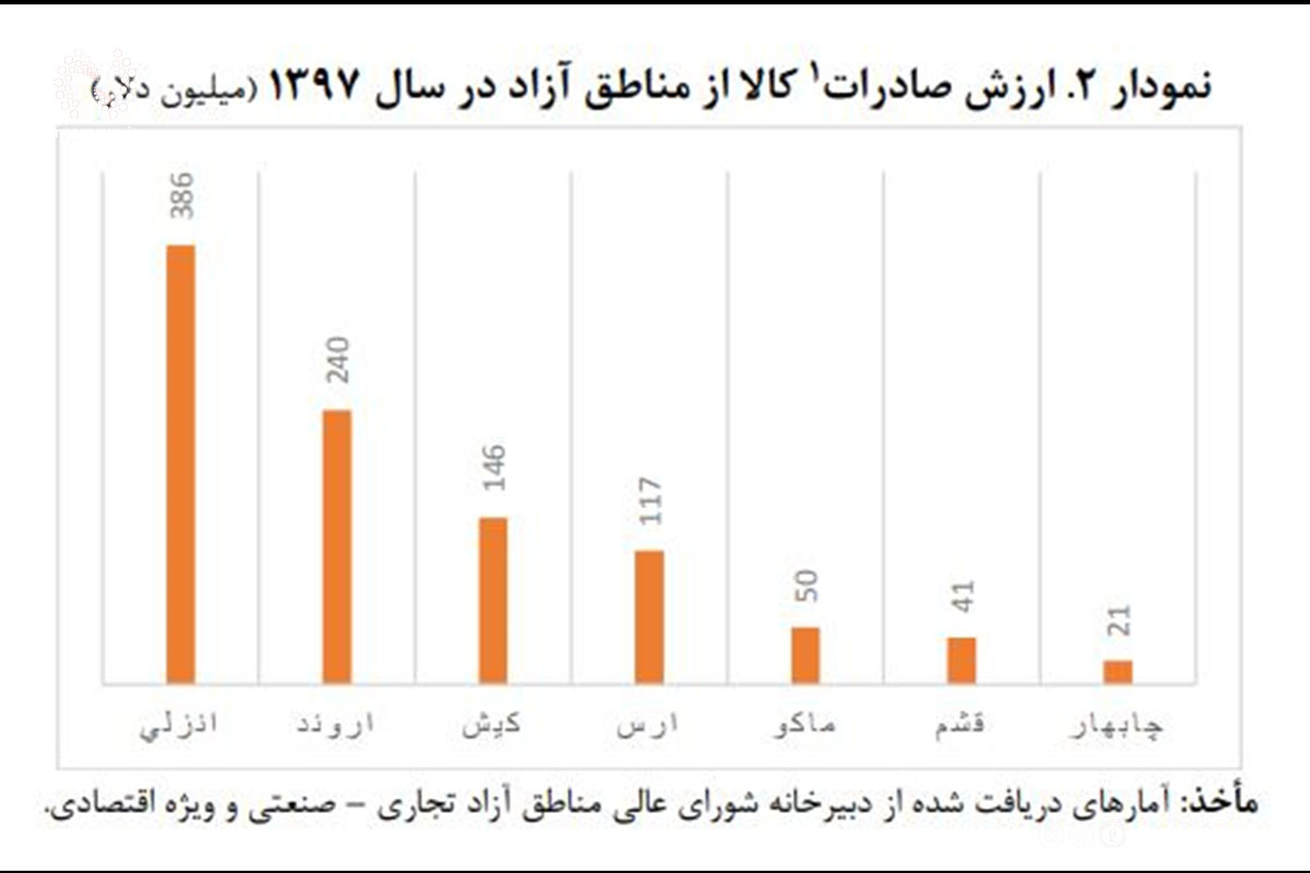 براساس گزارش بازوی کارشناسی مجلس، میزان صادرات (مجموع صادرات کالا و خدمات و صادرات مجدد به خارج) از مناطق آزاد کشور در سال 1397 مطابق نمودار زیر است: