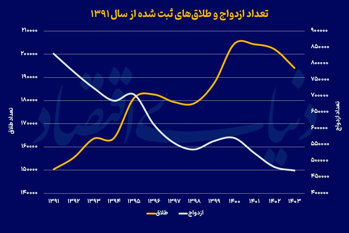 به گزارش نصر، بررسیهای «دنیایاقتصاد» نشان میدهد دو عامل اصلی، زنگ خطر کاهش تمایل به ازدواج را در جامعه ایران به صدا درآورده است. اول، بیکاری، تورم و نابسامانیهای اقتصادی نه تنها بسیاری را از تامین حداقل پیشنیازهای زندگی مانند مسکن ناامید کرده، بلکه تشکیل خانواده را نیز در ذهن جوانان هراسانگیز کرده است. دوم، تغییرات فرهنگی مانند در اولویت قرار گرفتن تحصیل و اشتغال، همچون بسیاری از کشورهای جهان، در ایران نیز موجب کاهش گرایش به ازدواج شده است. مهمترین پیامد بیمیلی به تشکیل خانواده، روند نزولی فرزندآوری در کشور در یک دهه اخیر بوده است. با وجود سیاستهای گسترده تشویقی دولت، تعداد موالید در سال ۱۴۰۳ به کمترین میزان خود از سال ۱۳۵۰ رسید.