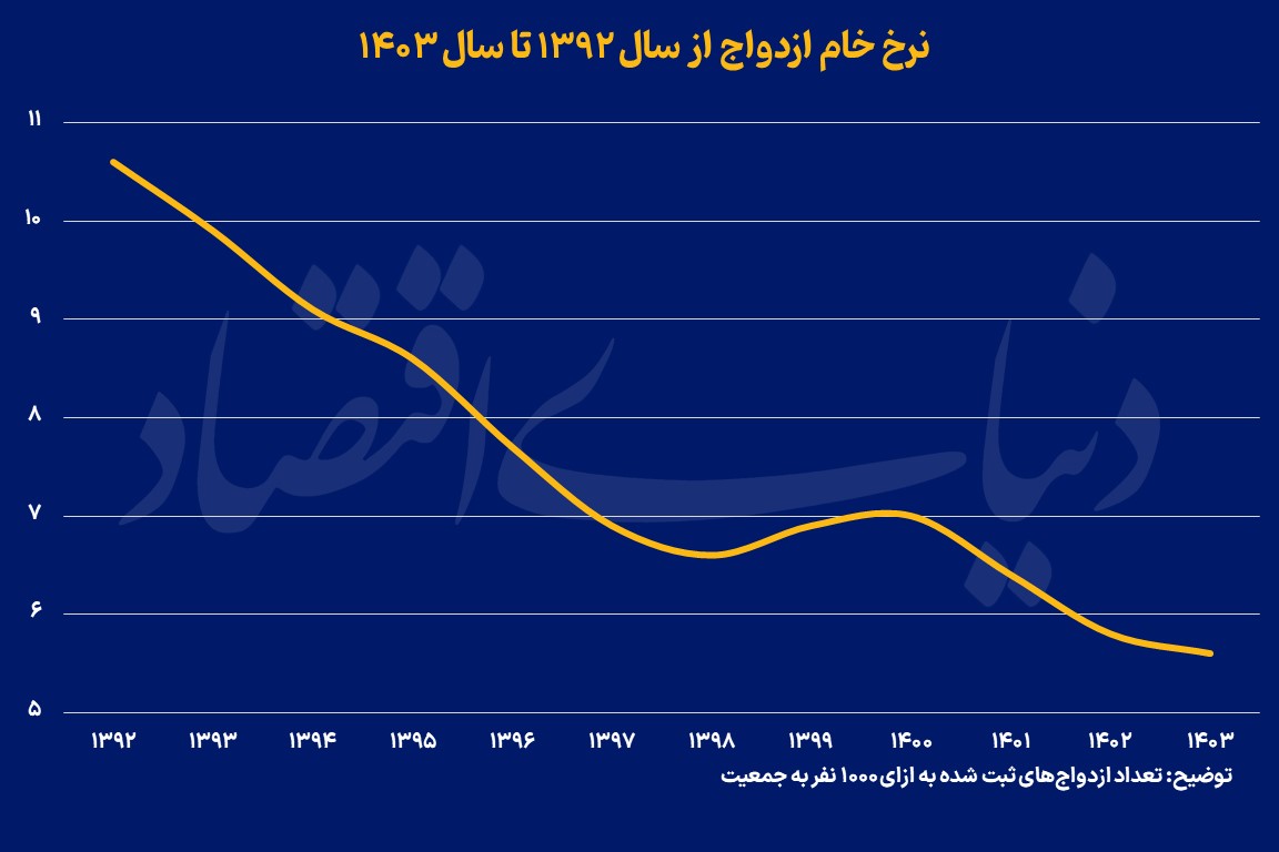 در سالهای گذشته دولتها در تلاش بودهاند تا با تبلیغات گسترده و اعطای تسهیلات، جوانان را به ازدواج در سنین پایین و فرزندآوری تشویق کنند. بااینحال کاهش تعداد ازدواج با وجود افزایش جمعیت در یک دهه اخیر به اصلیترین عامل کاهش فرزندآوری تبدیل شده است. در سال 1403 نیز تعداد موالید به کمترین میزان خود از سال 1350 رسید. بنابراین نابسامانی اقتصاد کلان، مانند تورمهای بالا و کاهش قدرت خرید خانوارها، تلاشها و هزینههای دولت در راستای افزایش ازدواج جوانان و فرزندآوری را خنثی کرده است.
