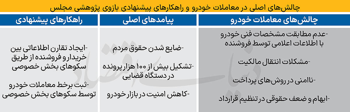 مرکز پژوهشهای مجلس شورای اسلامی ایران در گزارشی تحت عنوان «آسیبشناسی فرآیند معاملات خودرو و ارائه راهکارهای سیاستی مبتنی بر ظرفیتهای دولت الکترونیکی در کشور» به فرآیند سنتی خرید و فروش خودرو و چالشهای موجود در آن پرداخته و در این زمینه راهکارهایی ارائه داده است. آنگونه که در این گزارش آمده، تنها در سال 1401 بیش از هفت میلیون معامله در بازار خودروی ایران انجام شده که از این رقم، بیش از 6 میلیون مربوط به خرید و فروش خودروهای کارکرده بوده است. این آمار بیانگر این مطلب است که ارزش بازار خودروهای دست دوم رقمی بالغ بر 1800 همت است. با این وجود، نبود تقارن اطلاعاتی، بدین صورت که دو طرف معامله دارای اطلاعاتی مناسب و جامع از جزئیات معامله باشند در بازار خودروی ایران دیده نمیشود که همین مساله منجر به آن شده که سالانه بیش از 100 هزار پرونده قضایی روی هم تلنبار شود؛ این پروندهها موارد متعددی از کلاهبرداری از انتقال مال غیر گرفته تا عدم تعهدات طرفین و آسیب به خریداران و فروشندگان را شامل میشود.