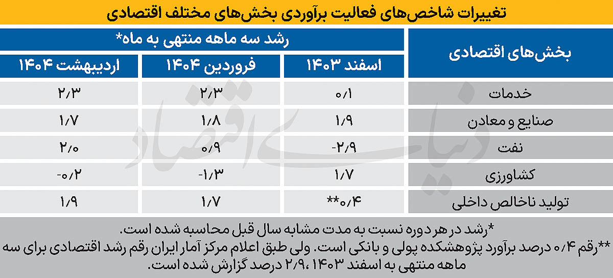 در سهماهه منتهی به ماه فروردین رقم برآوردی از رشد اقتصادی به ۱.۷ درصد و در سه ماهه منتهی به ماه اردیبهشت به ۱.۹ درصد رسیده است. با وجود نشانههایی که از بهبود در ماه پیش از جنگ ۱۲ روزه ثبت شده، اما با توجه به برآورد پایین از نرخ رشد اقتصادی و قرارگیری کشور در شرایط جنگی همچنان تردیدها در پایداری این روند باقی است. بر اساس برآوردهای پژوهشکده پولی و بانکی، در سه ماهه منتهی به اردیبهشت ماه، رشد بخش نفت افزایش حدود یک واحد درصدی ثبت کرده و بخش خدمات نیز توانسته رشد ۲.۳ درصدی ثبت شده در سه ماهه منتهی به فروردین را حفظ کند. همچنین در سه ماهه منتهی به اردیبهشت ماه از شدت منفی بودن رشد در بخش کشاورزی کاسته شده است و رشد در این بخش به نزدیک صفر رسیده است.