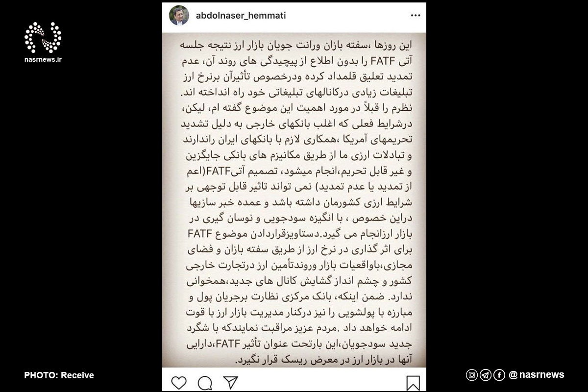 به گزارش نصر به نقل از تسنیم، عبدالناصر همتی در تازهترین یادداشت اینستاگرامی نوشت: این روزها، سفتهبازان و رانتجویان بازار ارز نتیجه جلسه آتی FATF را بدون اطلاع از پیچیدگىهاى روند آن، عدم تمدید تعلیق قلمداد کرده و درخصوص تأثیرآن بر نرخ ارز تبلیغات زیادی در کانالهای تبلیغاتی خود راه انداختهاند.