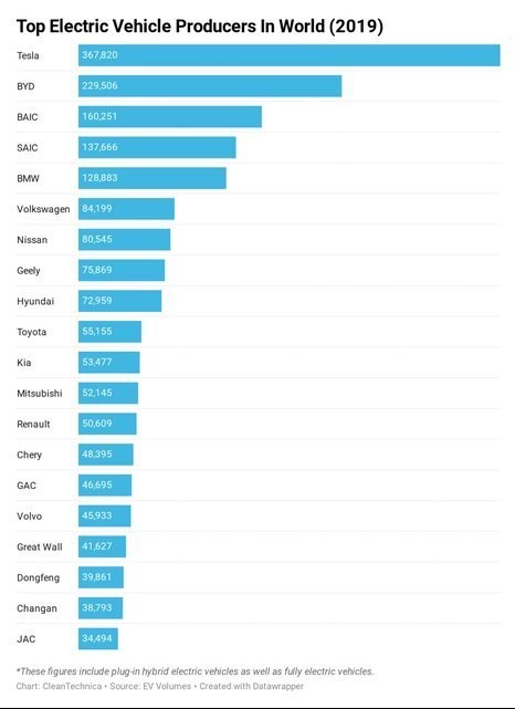 بر اساس گزارشی که در وب سایت cleantechnica آمده است، برترین خودروساز الکتریکی در سال 2019 میلادی شرکت آمریکایی تسلاموتورز بوده و بعد از آن، دو شرکت چینی BYD و BAIC عنوان بهترین تولیدکنندگان خودروهای برقی، پاک و دوستدار محیط زیست را به خود اختصاص داده اند.