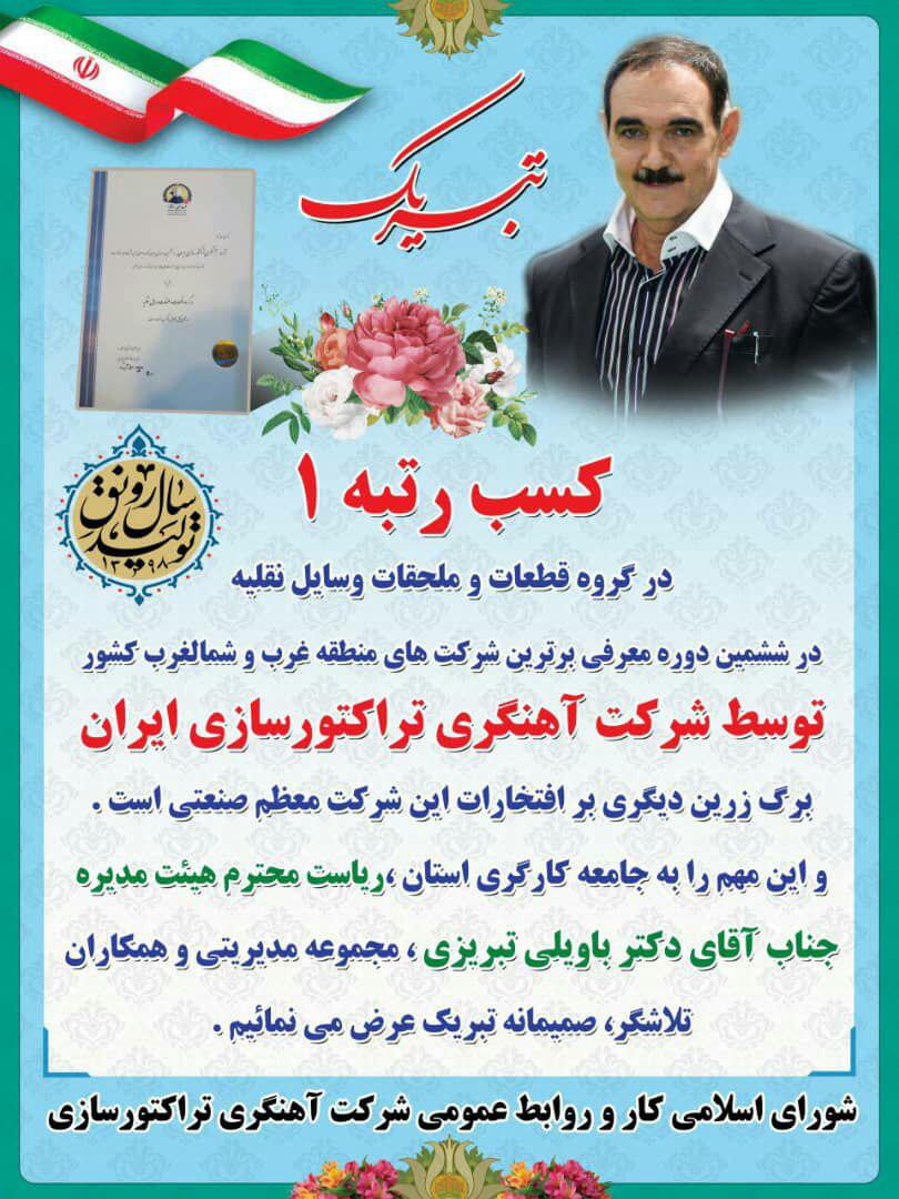 به گزارش نصر، دراین ارزیابی که بین 500 شرکت برتر انجام گرفته بود؛  شرکت آهنگری تراکتورسازی ایران موفق شد با کسب این رتبه افتخار دیگری برافتخارات خود بیافزاید.