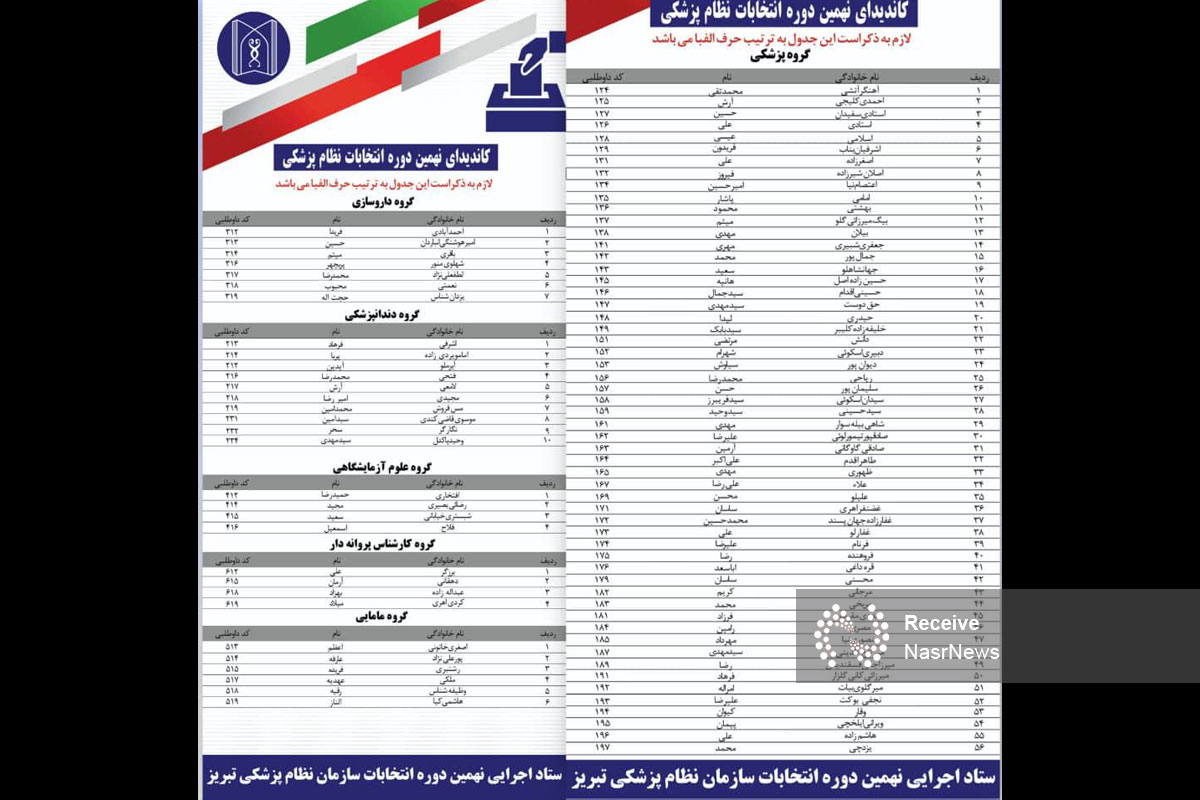 نصر: نهمین دوره انتخابات هیأت‌مدیره سازمان نظام پزشکی تبریز ویژه مشمولین ماده ۴ قانون نظام پزشکی شامل پزشکان، دندانپزشکان، داروسازان، دکترای علوم آزمایشگاهی، ماماها و لیسانس‌های پروانه‌دار، روز جمعه ۲۵ مهرماه ۱۴۰۴ برگزار می‌شود.