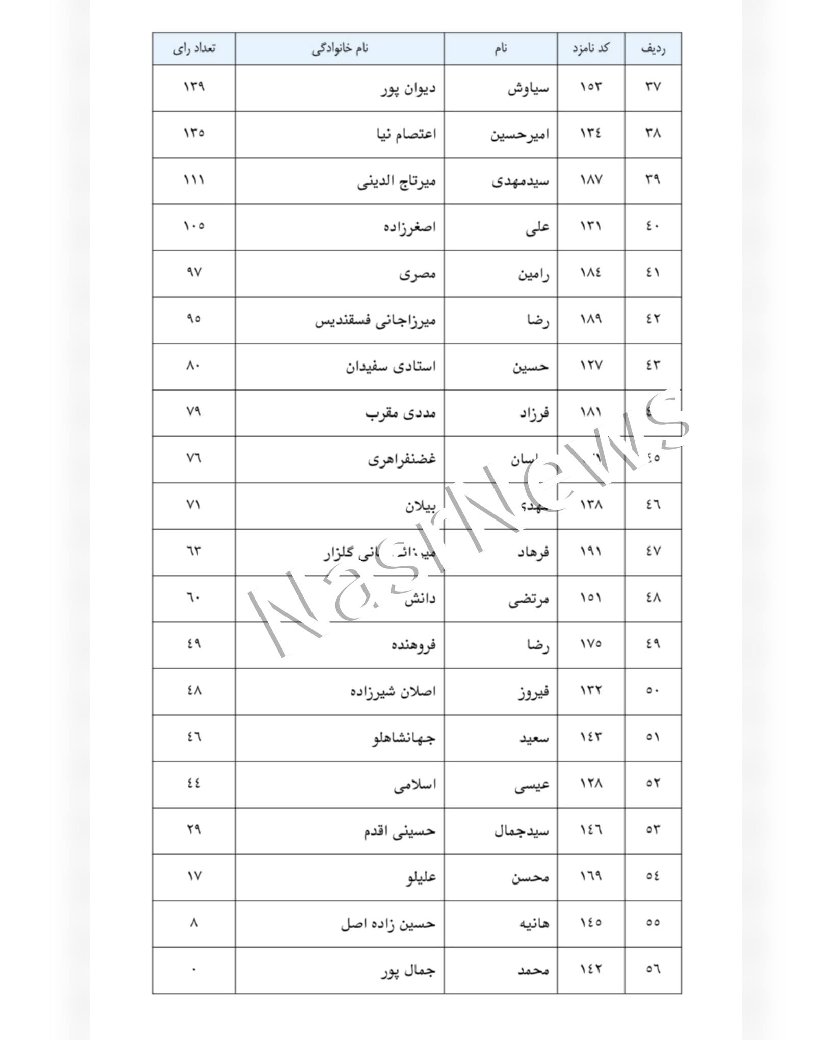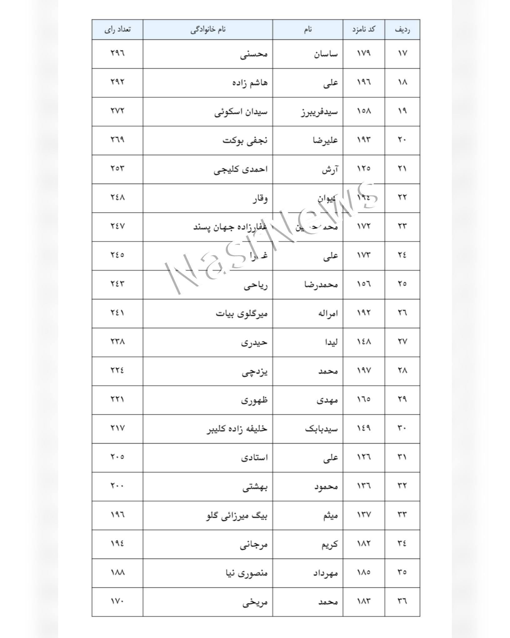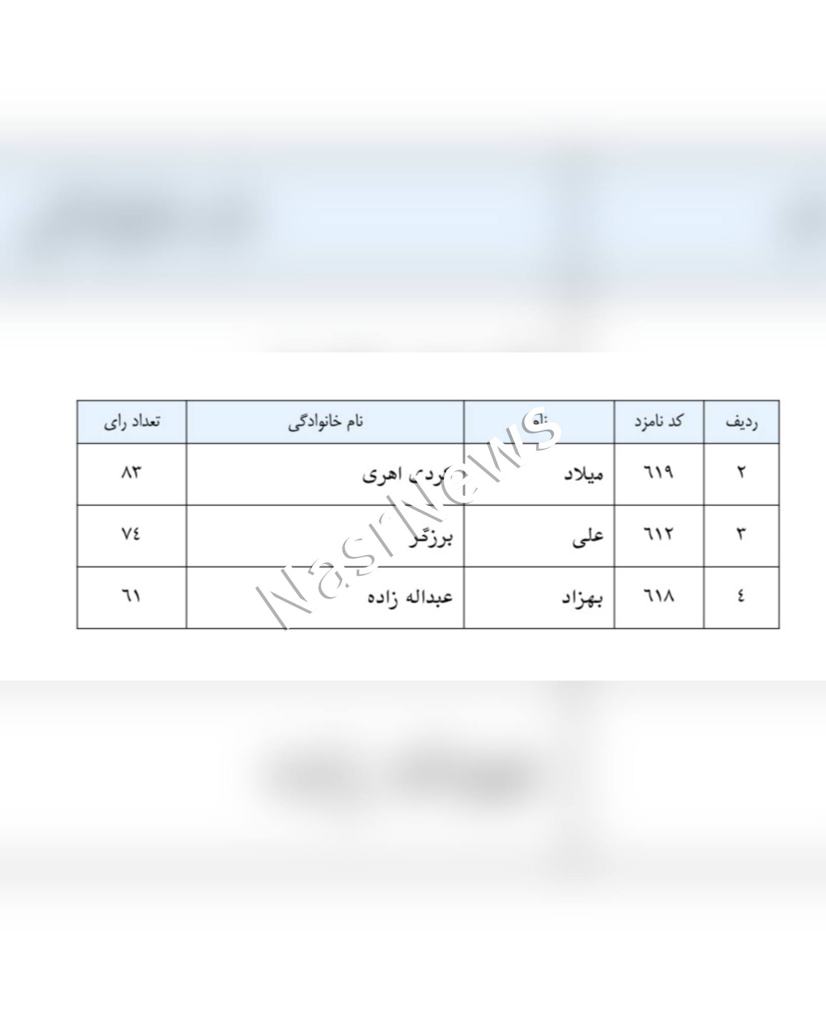 به گزارش نصر، از مجموع ۳هزار و ۹۷۴ رأی مأخوذه، تعداد ۱۰ رأی سفید و ۳هزار و ۹۶۴ برگ رأی صحیح به صندوقها انداخته شده است.