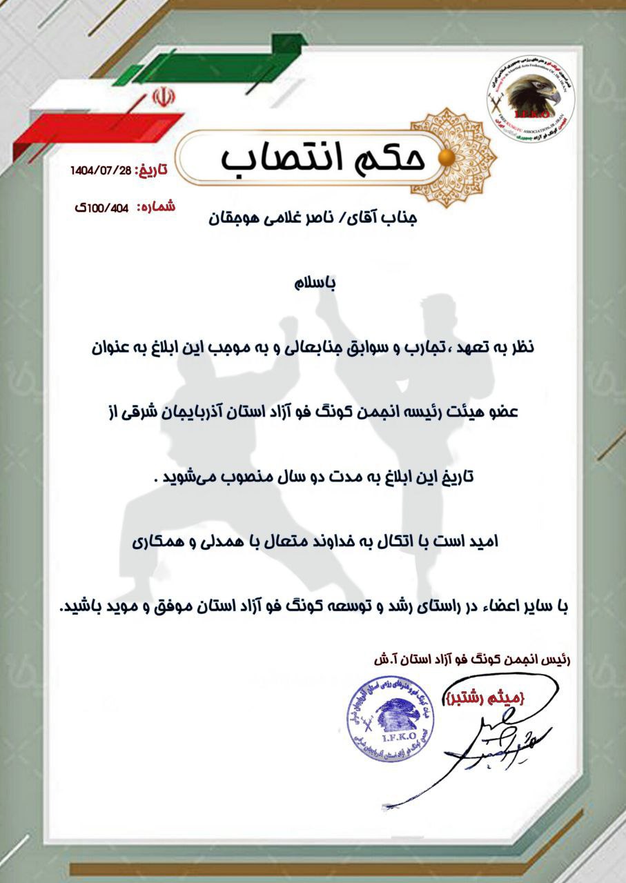 به گزارش نصر، با حکم میثم رشتبر، رئیس انجمن کونگ فو آزاد استان آذربایجان شرقی، ناصر غلامی هوجقان به این سمت منصوب گردید. این حکم در نشستی با حضور برخی از اعضای این انجمن اهدا شد.