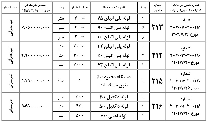 آگهي مناقصه عمومی خريد - نوبت اول ودوم | شماره های 213، 214، 215 و 216 سال 1404