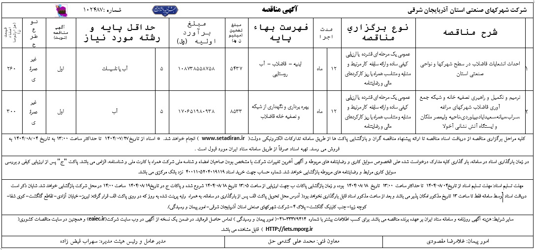 شركت شهركهای صنعتي استان آذربايجان شرقي | آگهی مناقصه | شماره :102487